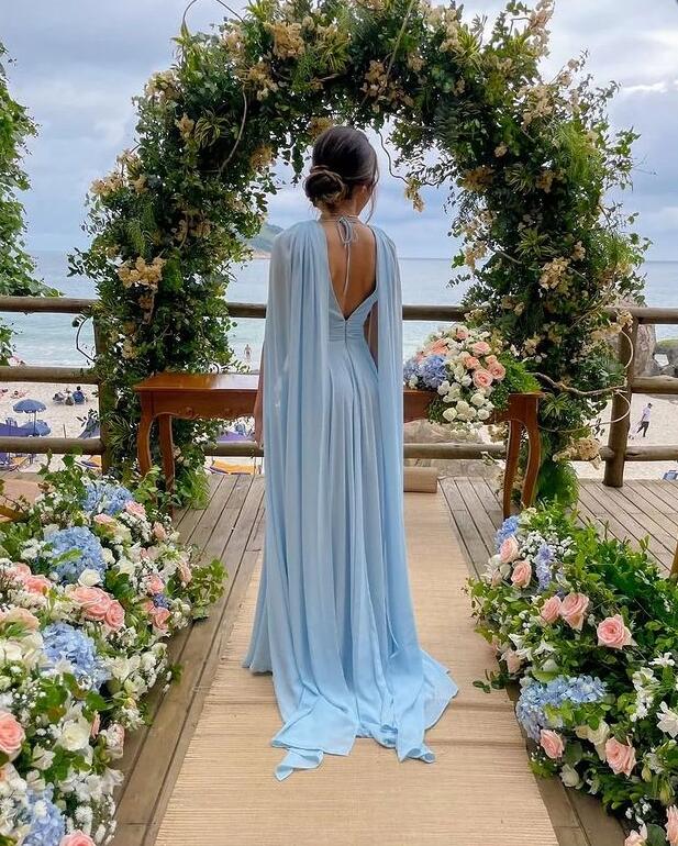Beautiful A Line V Neck Light Blue Long Prom Dresses