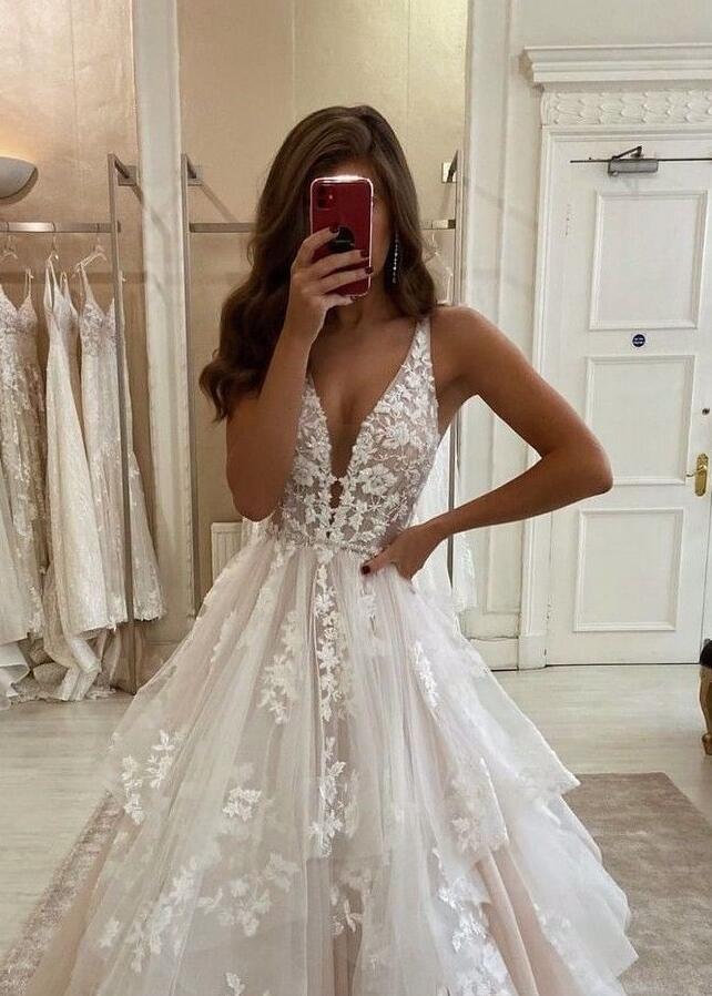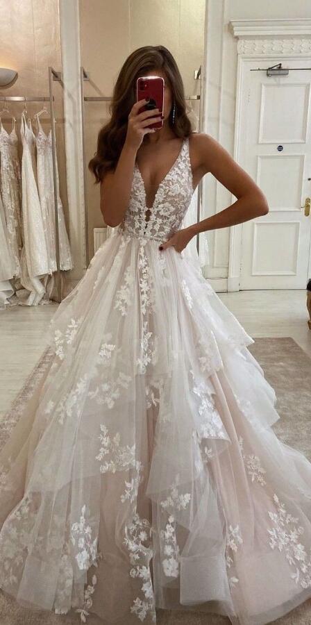 Charming Ivory sleeveless v-neck applique ruffles wedding dress