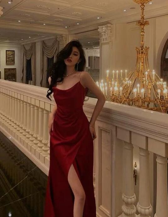 Simple A line Straps Dark Red Satin Prom Dresses