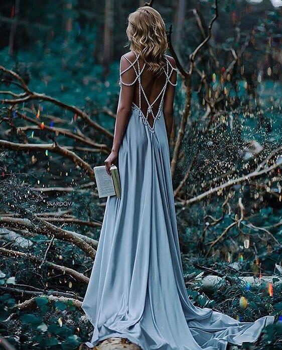 Dusty Blue Pearl Back Long Evening Dresses