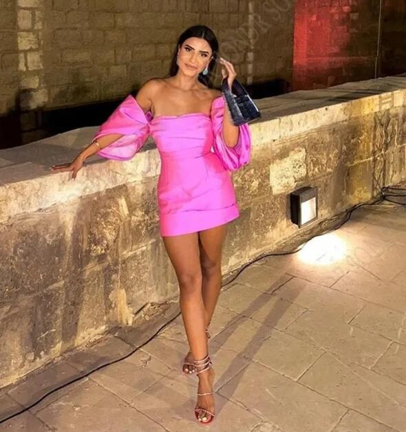 Modern Off the Shoulder Pink Satin Short Mini Prom Dress Dubai Arabic Women Birthday Gowns