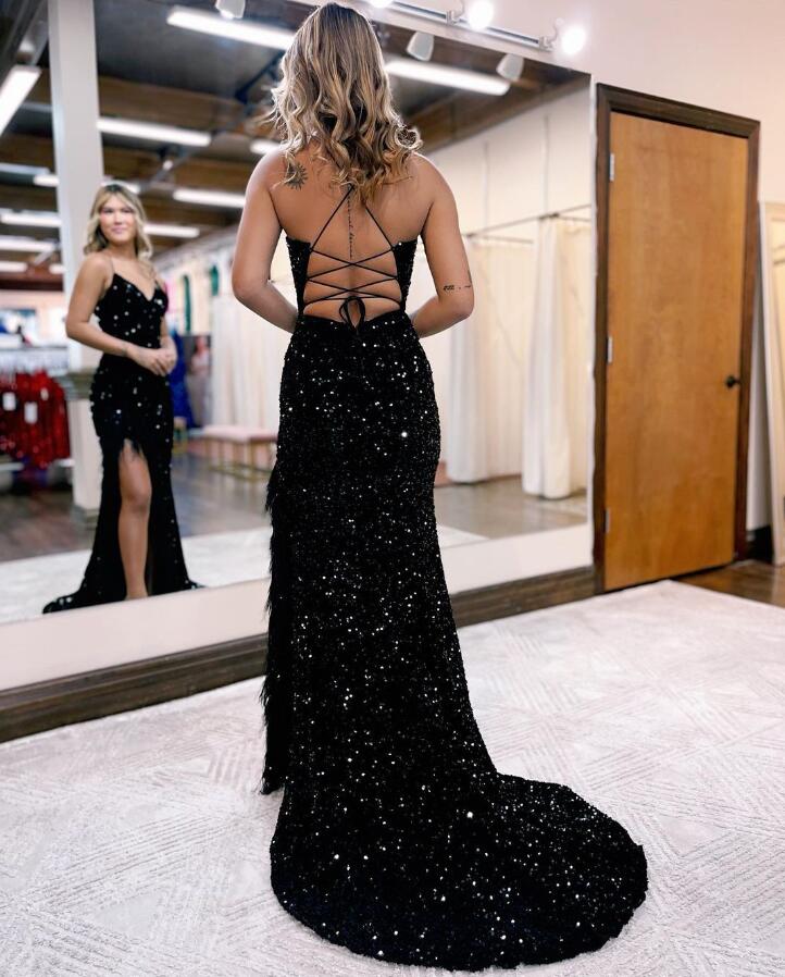 Mermaid V Neck Black Sequins Prom Dresses with Slit