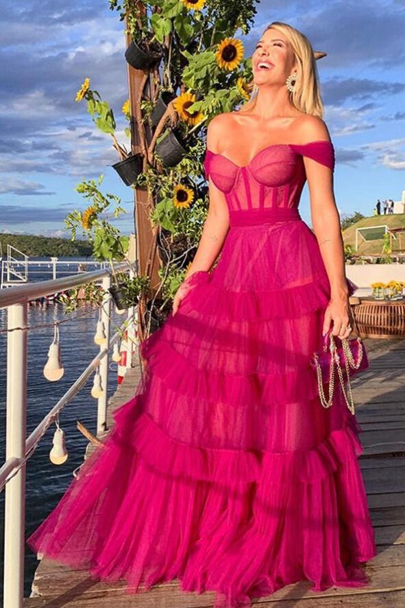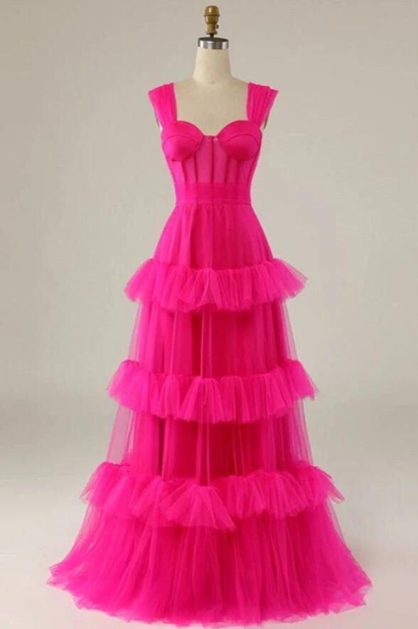 Sweetheart Hot Pink A Line Multi Layers Tulle Formal Prom Dresses