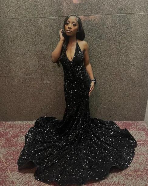 Mermaid Halter V-Neck Backless Sequins Long Evening Dress With Sweep Train