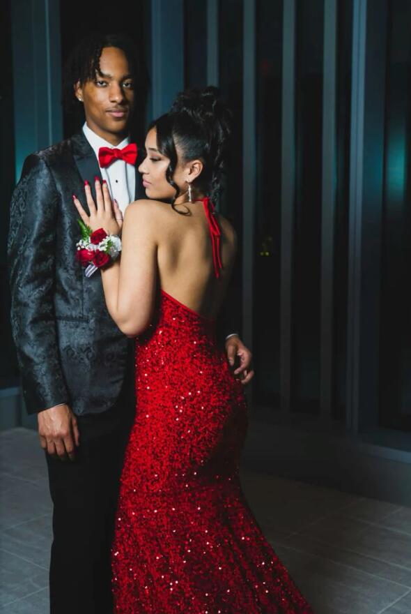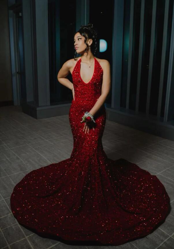 Glitter Mermaid Red Sequins Backless Evening Dress With Train
