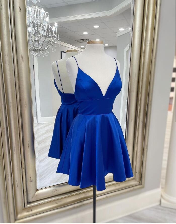 Spaghetti Straps V Neck Royal Blue Short Homecoming Dresses