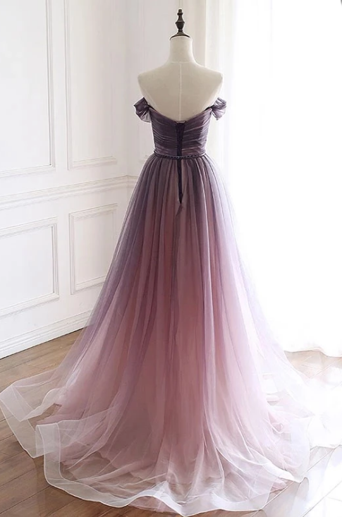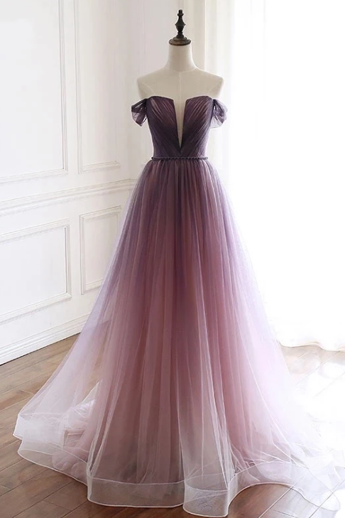 Unique Off Shoulder Gradient Purple Tulle Long Prom Dresses