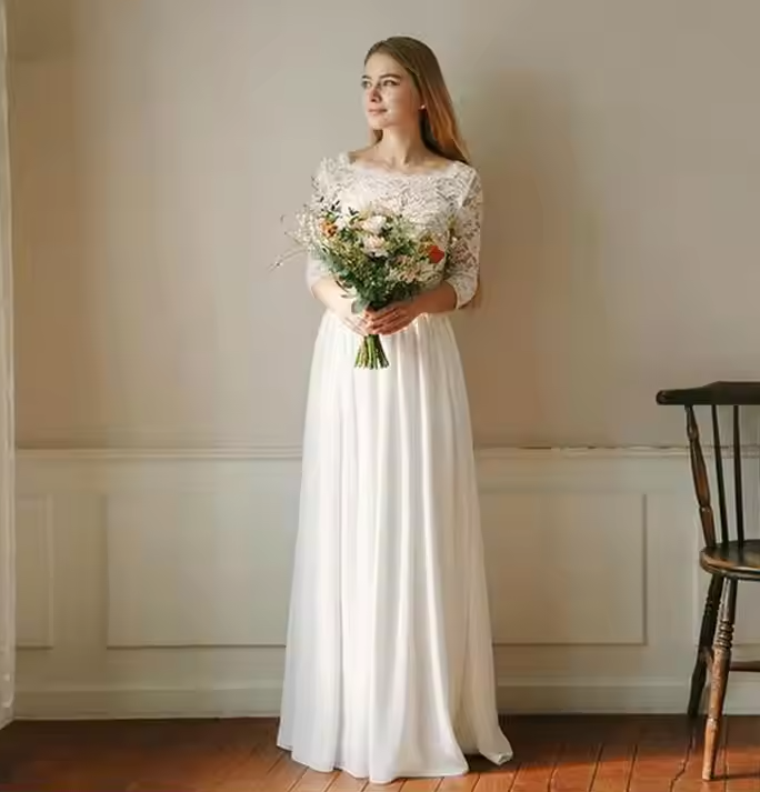 A Line Lace Chiffon Floor Length Ivory Wedding Dresses