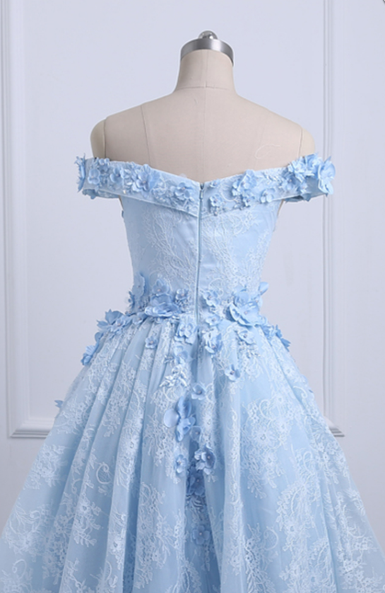 Off Shoulder High Low Sweetheart Blue Lace Prom Dresses