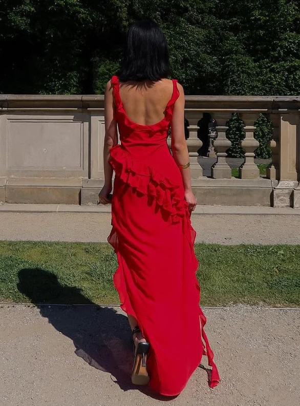 Sexy Straps A Line Red Chiffon Ruffle Prom Dresses