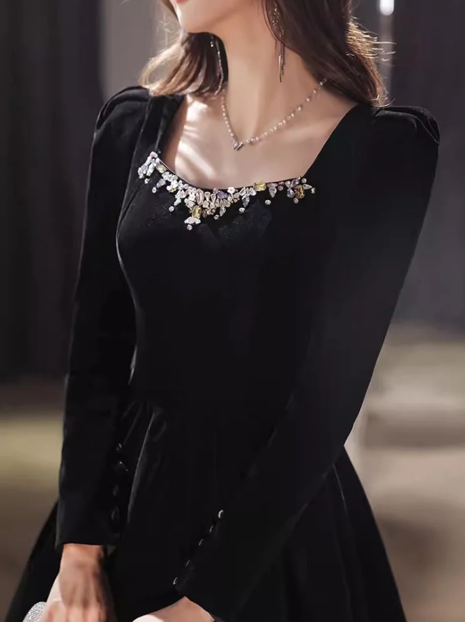 Beautiful A line Black Velvet Long Sleeves Prom Dress With Beading