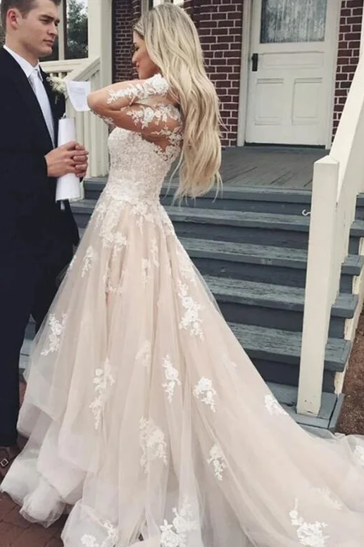 Gorgeous A line V neck Long Sleeves Lace Wedding Dresses