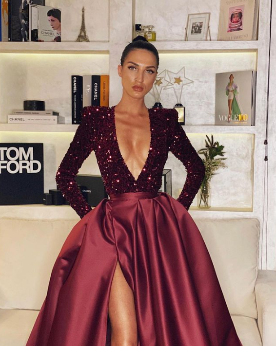 Elegant V Neck Long Sleeve Burgundy Sequin Prom Dresses with Slit and Pockets
