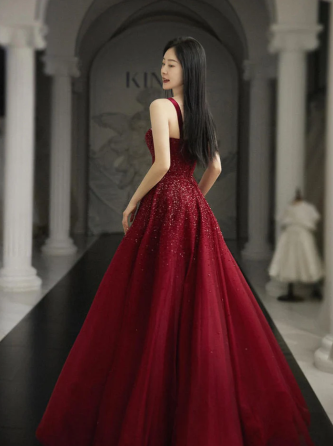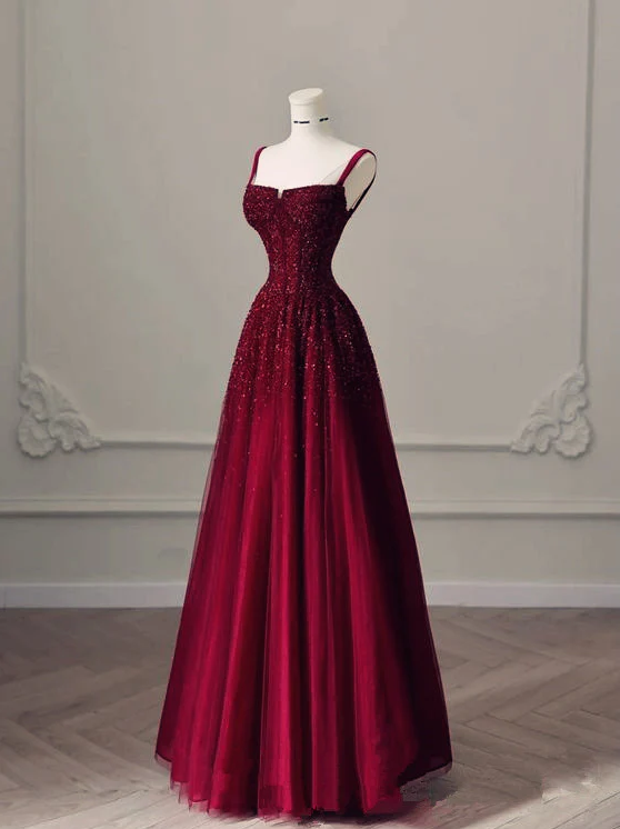 A Line Burgundy Straps Tulle Evening Dresses With Beading