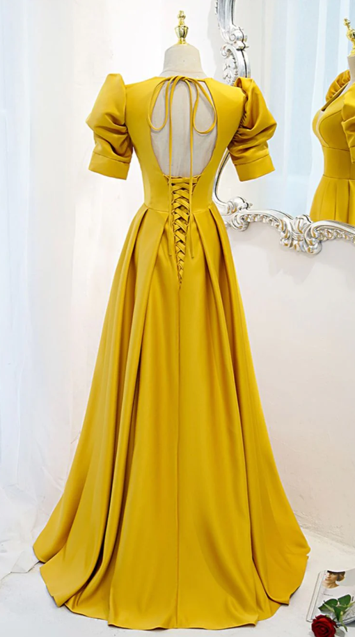 Yellow Satin A Line V Neck Lace Up Prom Dresses