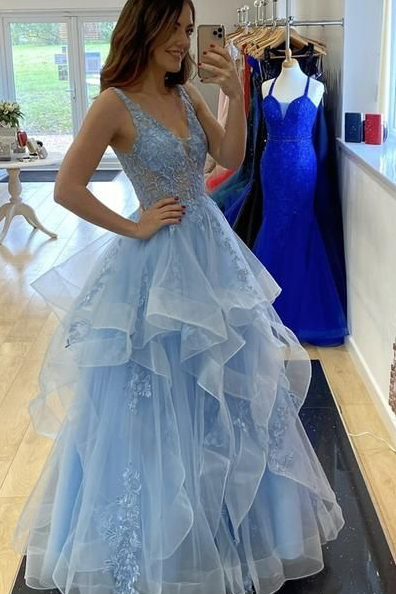 Charming V Neck Fluffy Blue Lace Long Prom Dresses