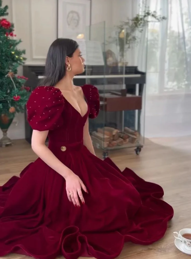 A Line Floor Length Dark Red Velvet V Neck Short Puff Sleeve Evening Dresses