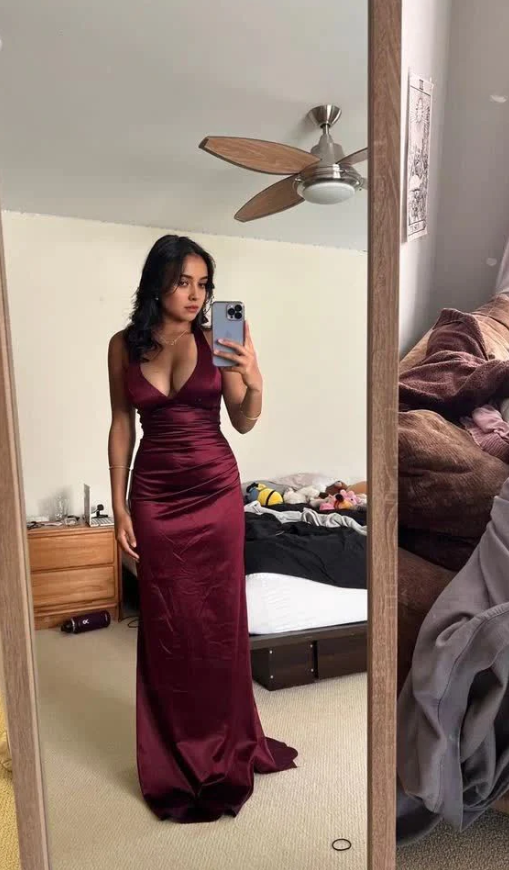 Simple Burgundy Satin Plunging V- Neckline Evening Dresses