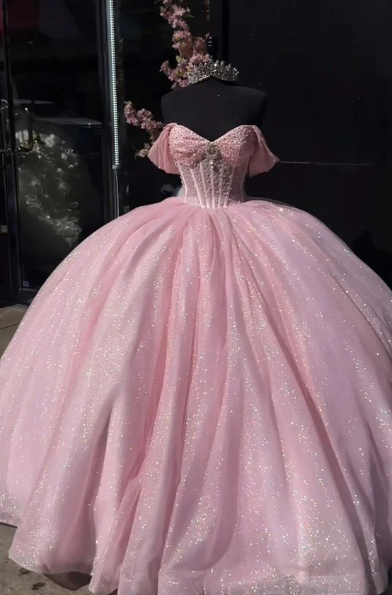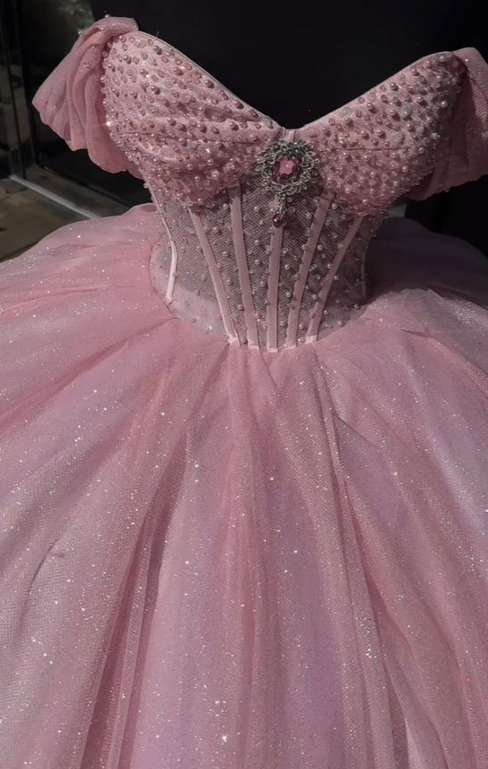 Glitter Pearls Ball Gowns Pink Quinceanera Dresses Sweet 15 Dresses