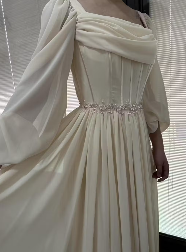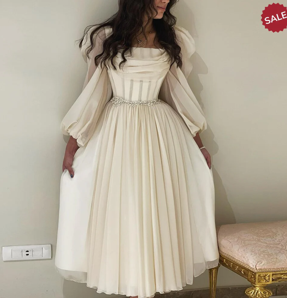 Dubai Beige Long Sleeves Tea Length Arabic Evening Dress with Belt