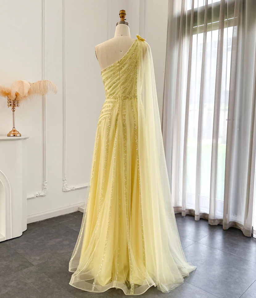 One Shoulder Luxury Yellow Evening Dress with Beading