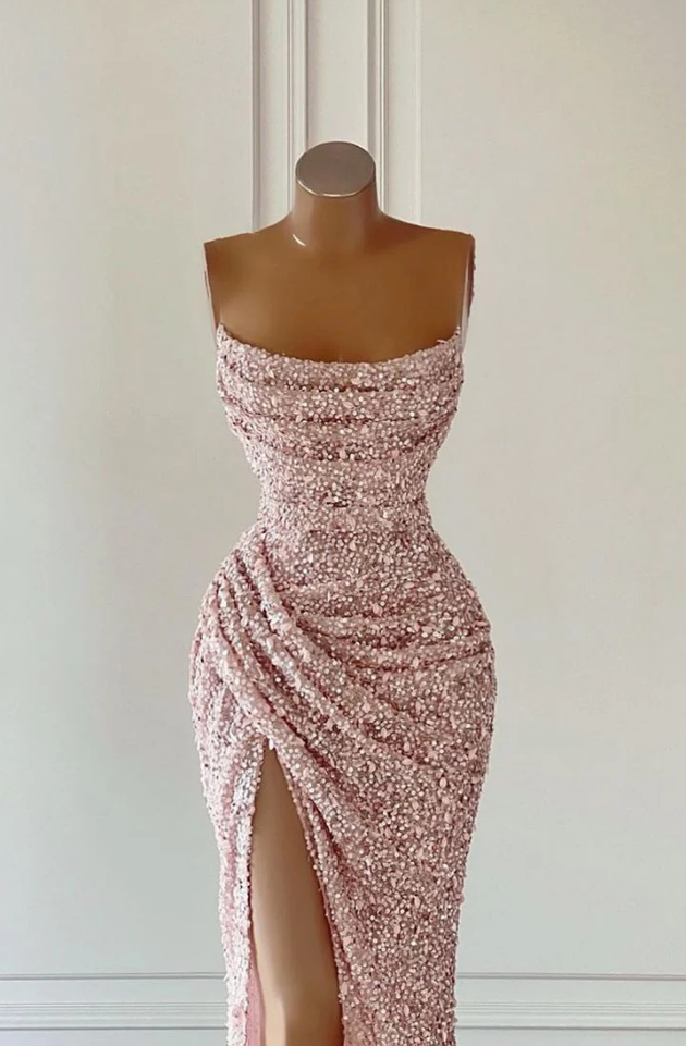 Gorgeous A Line Pink Sequined Sleeveless Prom Dress With Slit