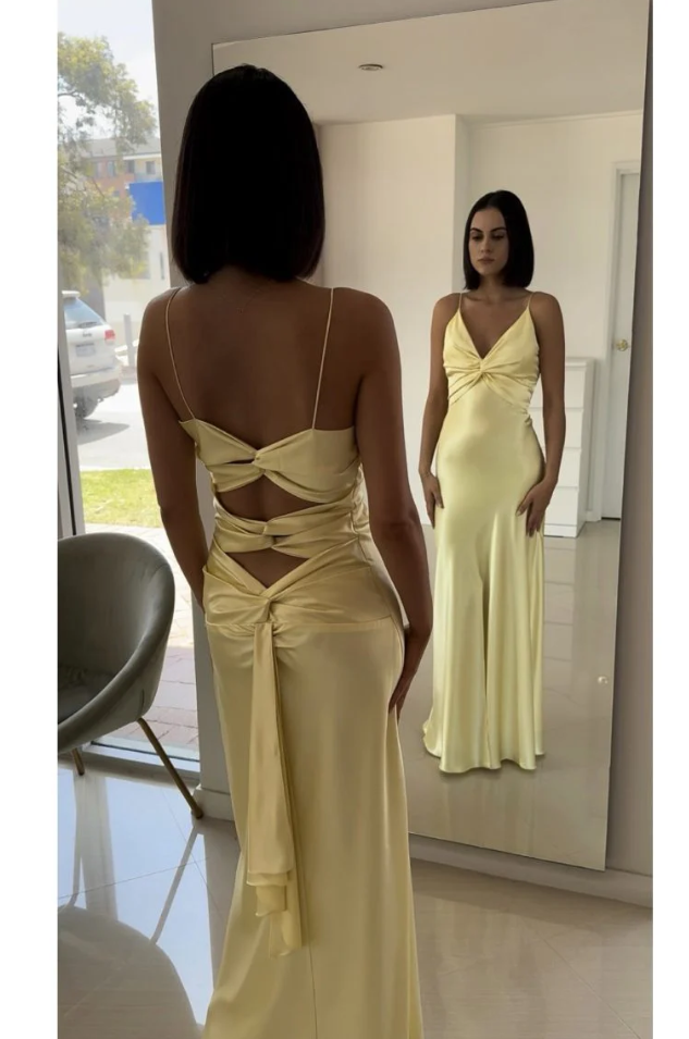Fashion V-neck Spaghetti Straps Yellow Long Satin Evening Dresses