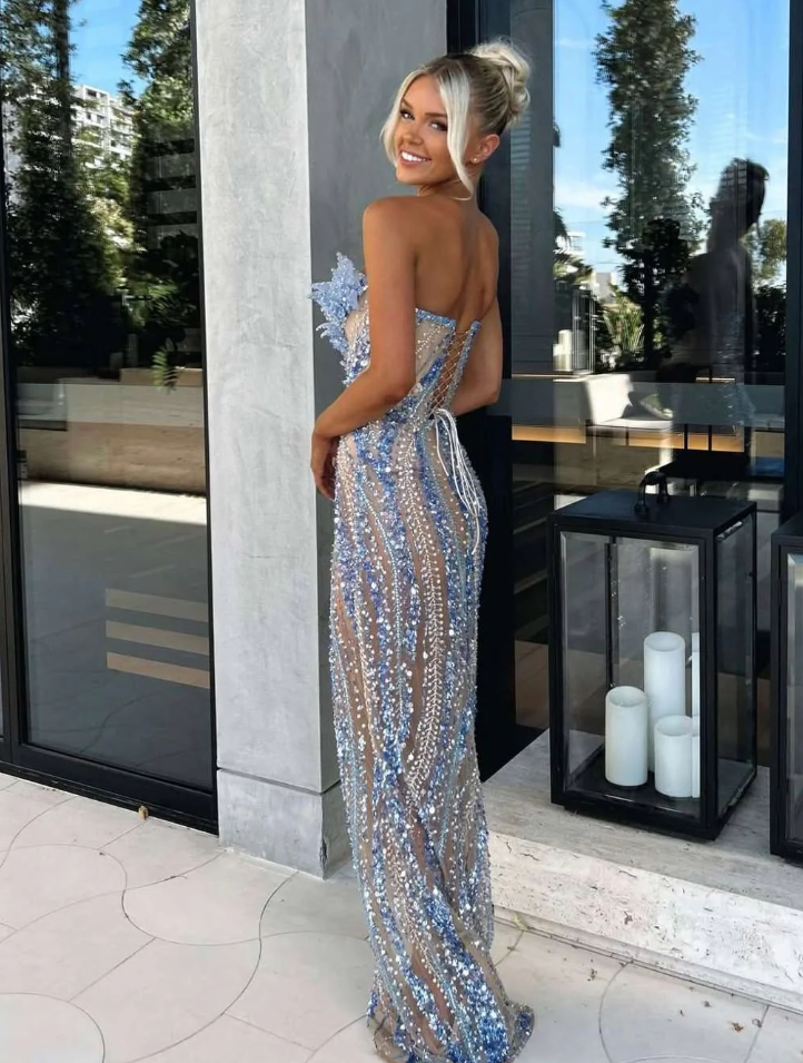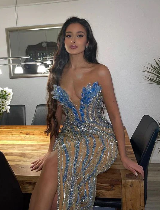 Gorgeous Sexy V Neck Slit Beading Prom Dresses