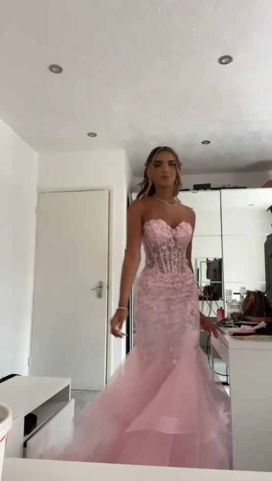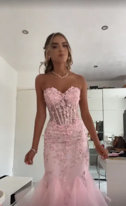 Mermaid Sweetheart Pink Tulle Long Prom Dress With Lace
