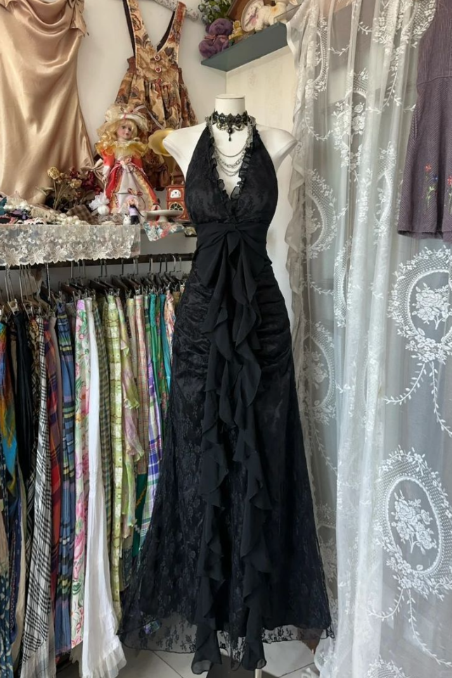 Halter Black V Neck Long Prom Dresses