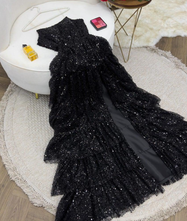 Modest Floor Length Strapless Black Sequin Slit Prom Dresses