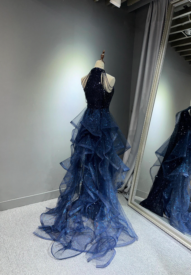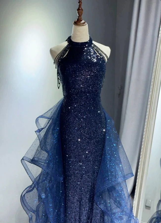 Sexy Navy Blue Sequins Long Prom Dresses For Women