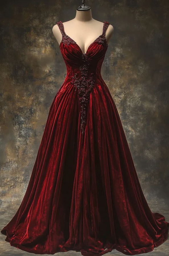 Vintage A Line Burgundy Velvet Prom Dresses With Beading