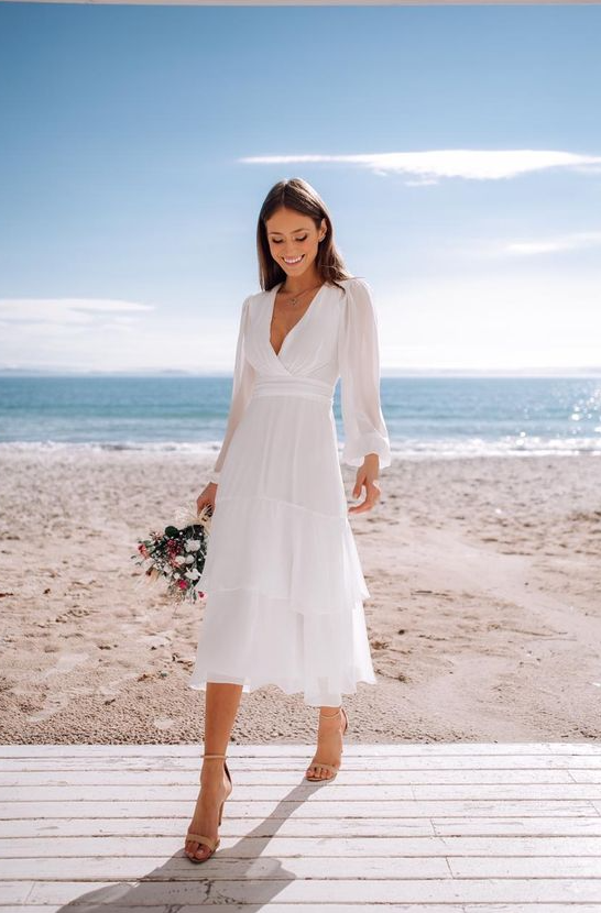Simple Chiffon Tea-length Beach Wedding Dresses With Long Sleeve