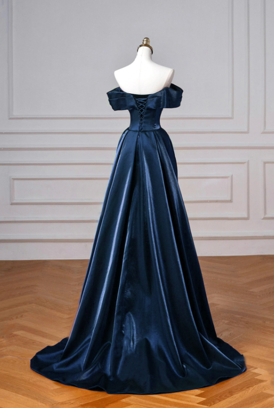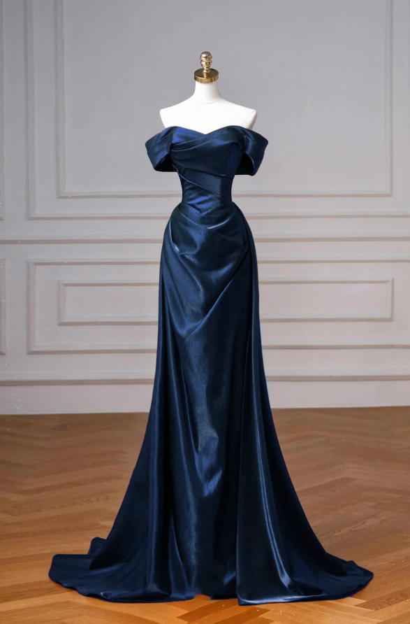 Elegant Off the Shoulder Navy Satin Long Prom Dresses