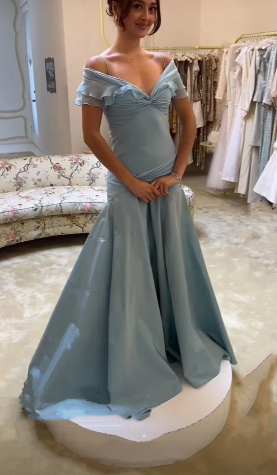 Simple Off Shoulder Long Blue Satin Prom Evening Dress