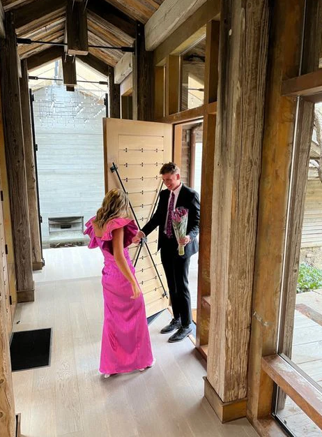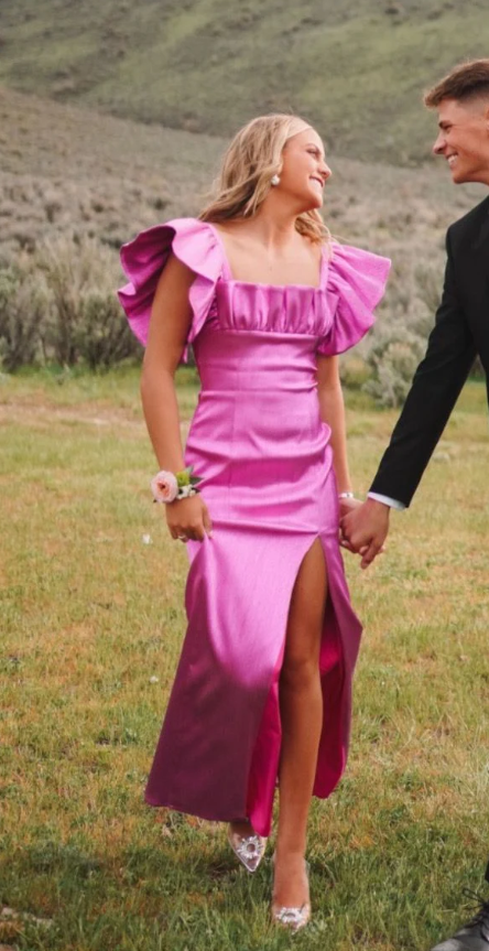 Floor Length Square Neck Flutter Sleeve Hot Pink Prom Dress with Split