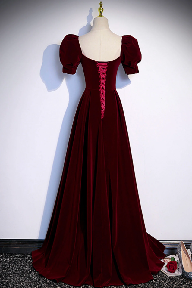 Vintage Short Sleeve Burgundy Velvet Long Prom Dress