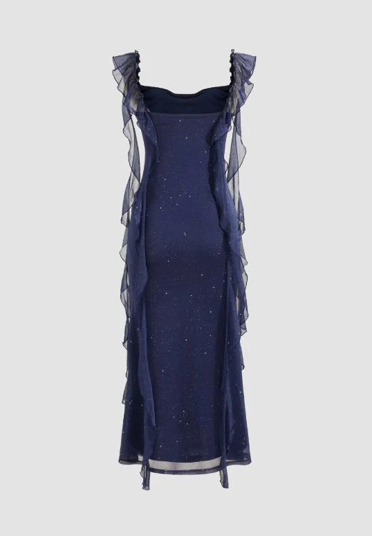 Simple Cowl Neck Sequin Ruffle Navy Blue Evening Dress