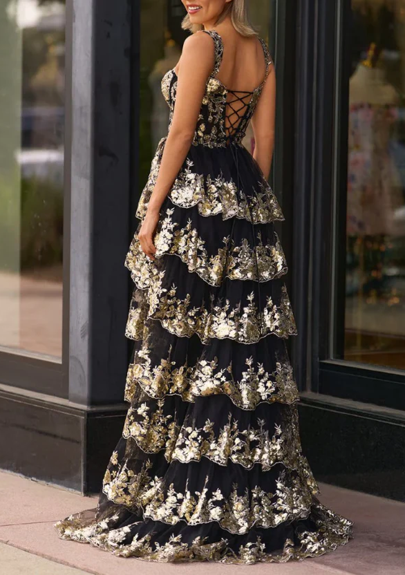 Sparkly Off The Shoulder Black Tulle Slit Prom Dress With Lace Appliques