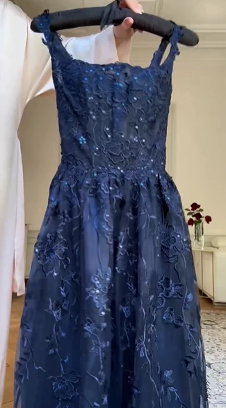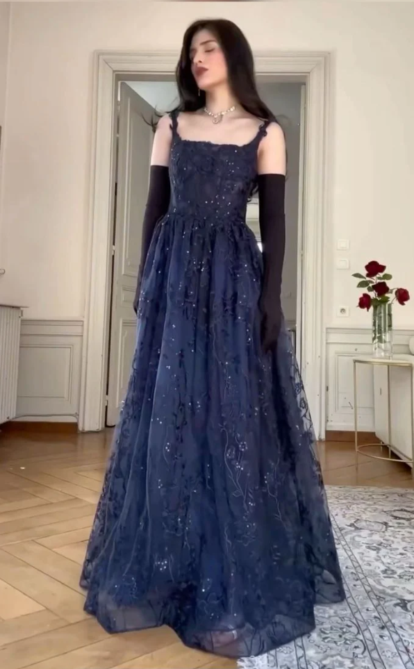 Elegant Navy Blue A Line Lace Appliques Prom Dress