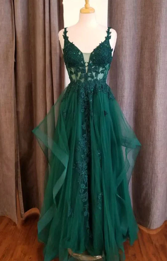 Deep V Neck Hunter Green Flower Straps Appliques Ruffles Prom Dress