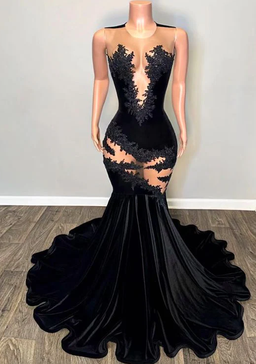 Sexy Black Mermaid Velvet Prom Dress With Lace Applique