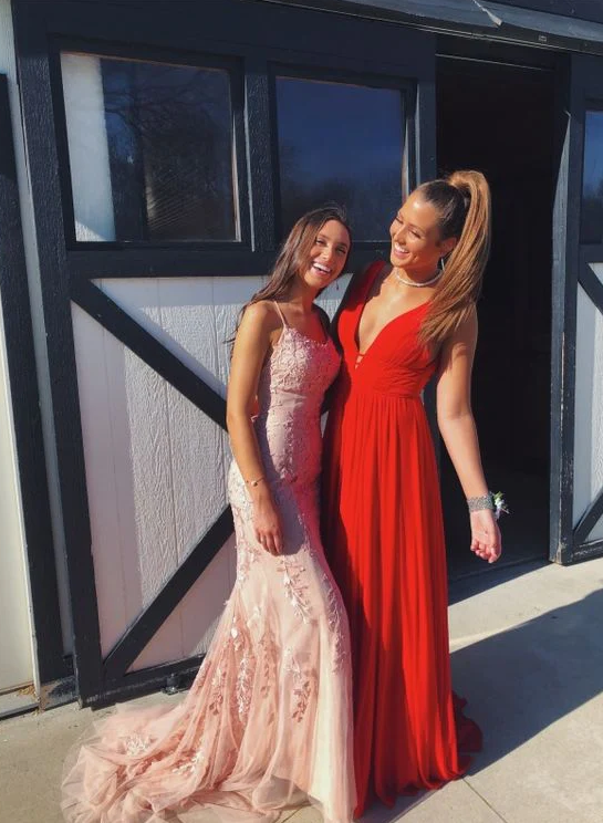 Mermaid Backless Pink Lace Formal Prom Dresses