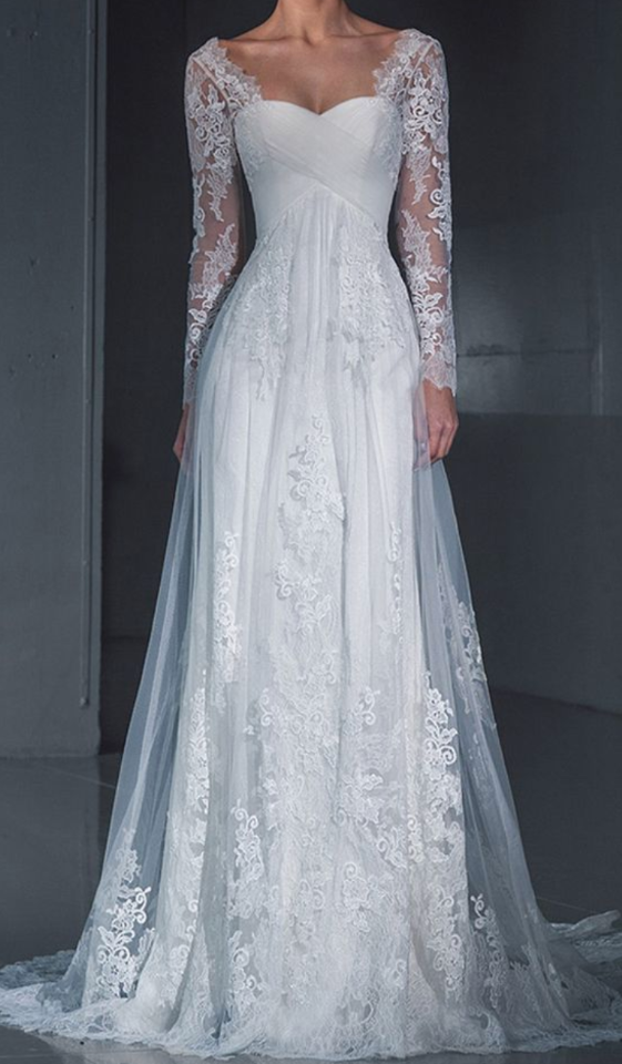 Floor Length A Line White Mermaid Lace Wedding Dresses With Long Sleeves
