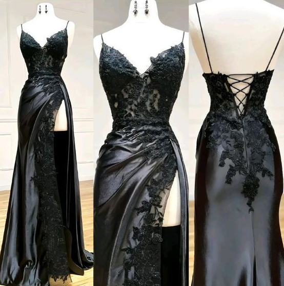 A Line V Neck Wine Red Satin Lace Long Prom Dresses