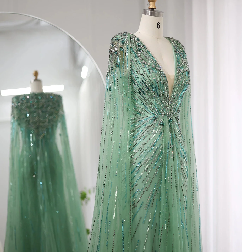 Sexy Luxury Dubai Sage Green Prom Dresses with Cape