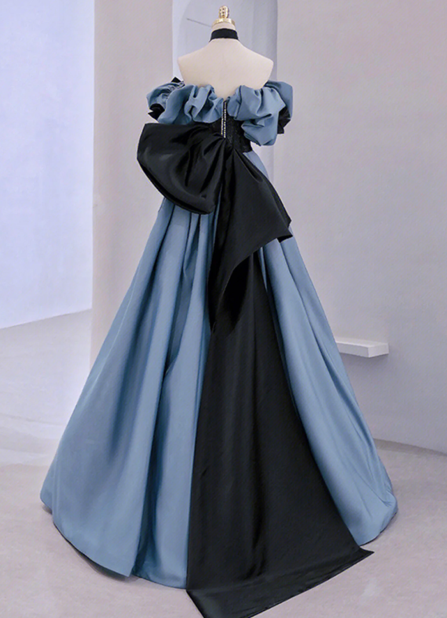 Off Shoulder Blue Satin Lace Long Prom Evening Dress