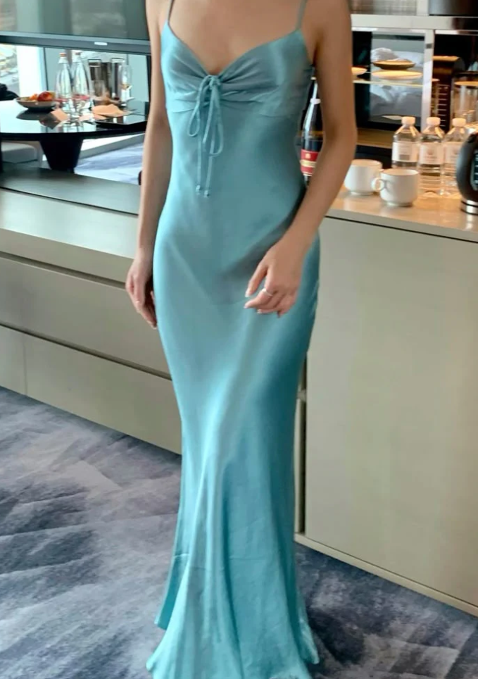 Spaghetti Straps Blue Satin Long Senior Prom Dress