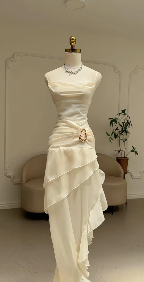 Vintage Spaghetti Strap Ivory Chiffon Evening Dress